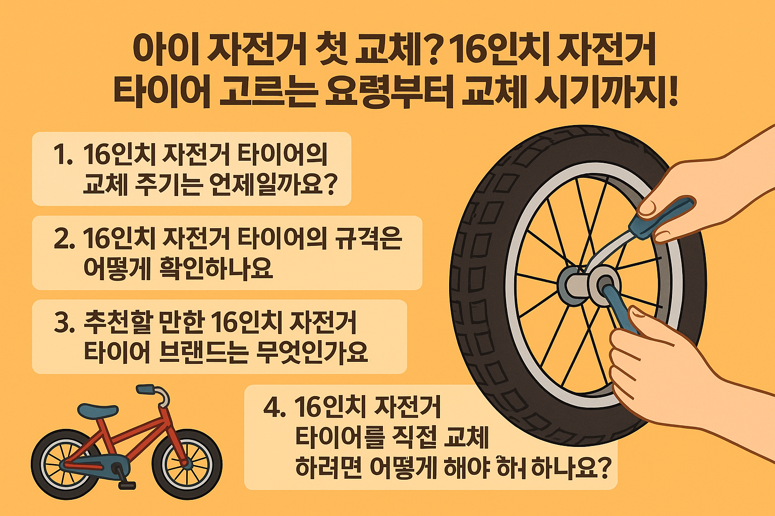 아이 자전거를 처음 사 주고 시간이 지나면 타이어 마모가 눈에 띄기 시작합니다. 특히 16인치 자전거는 유아부터 초등 저학년까지 사용하는 경우가 많아 안전한 주행을 위해 타이어 상태 점검이 중요합니다. 이 글에서는 '16인치 자전거 타이어'를 주제로, 교체 시기부터 규격 선택, 브랜드 추천, 직접 교체 방법까지 단계별로 자세하게 안내해드리겠습니다.